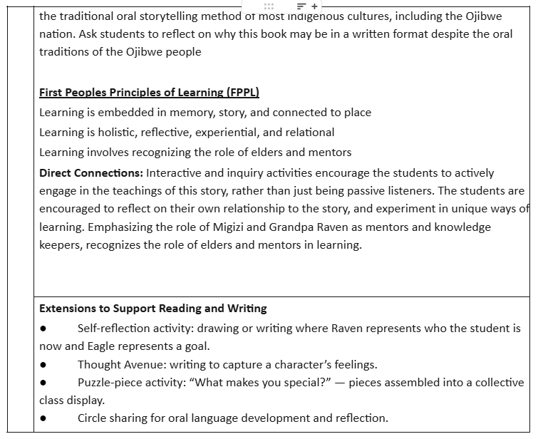 In Session One, students explored the meaning of âinquisitiveâ through think-pair-share and role-play questioning activities. They reflected on mentors in their own lives, connecting to Migizi and Grandpa Raven. Our main activity invited students to create a write-draw mind map, using Reuben to represent their current strengths and Migizi to represent their goals. I think offering flexible response helped keep the students engaged and eager to complete this task. We also included a sharing circle at the end for students to reflect on what the story helped them learn as well as our authentic way of acknowledging Indigenous pedagogy and the First Peoples Principles of Learning: learning is relational and embedded in story.